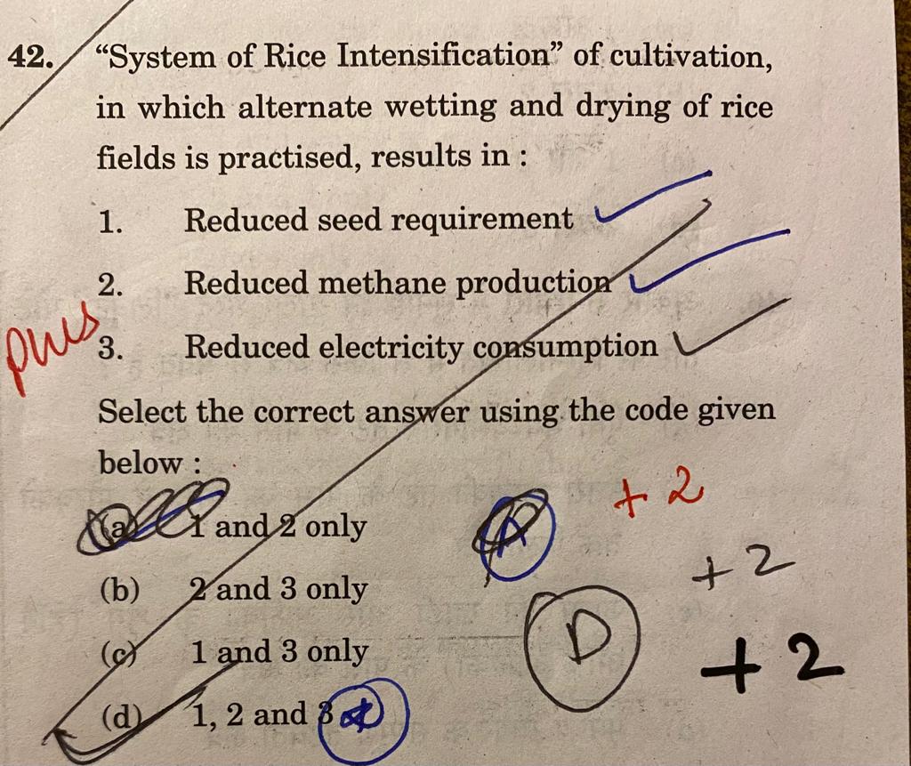 This question on “System of Rice Intensification” is almost a science-based question. One of the things about science-based questions that I have realized over the years is that it needs an assumption. The assumption is that science is about “a world of possibilities”. So statements which seem a little too far stretched, a little exaggerated or absurd are also often correct (in the past questions like- can satellite images measure chlorophyll content of vegetation for ex). So while reduced seed requirement and methane production seems natural and reduced electricity consumption a little dubious, go for 1,2, and 3. which is after all correct because with reduced irrigation needs under SRI, electricity consumption also reduces.