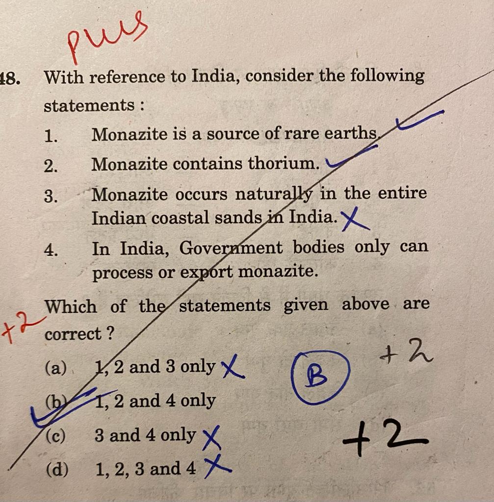 This is a very simple question where you apply the elimination technique to reach the answer. One is aware that Monazite is naturally found across Kerala coast, and it is one of the distinct facts we read during prep. It is highly unlikely that it is found across the Indian coast. Therefore it qualifies as an extreme statement. The moment you eliminate the third statement, you arrive at your answer which is B.